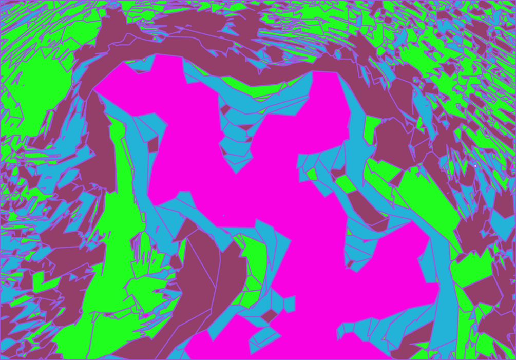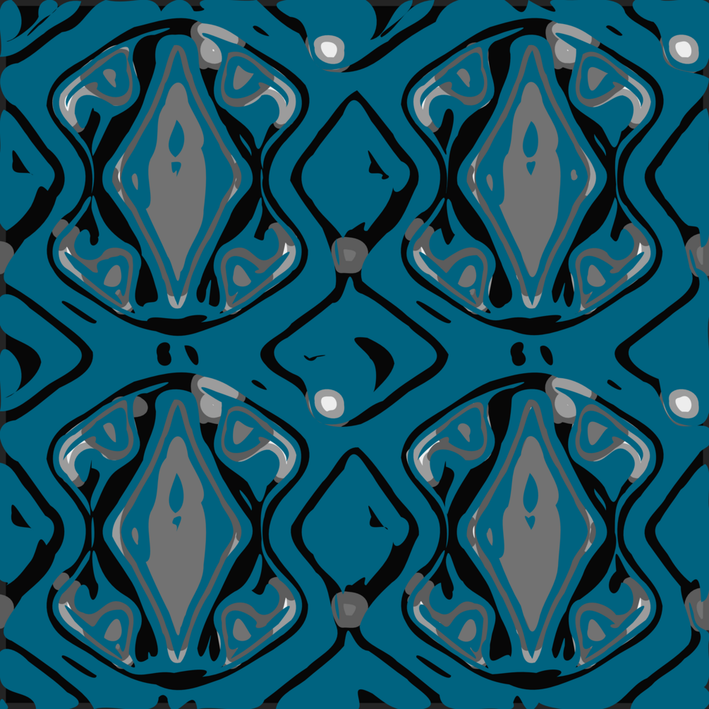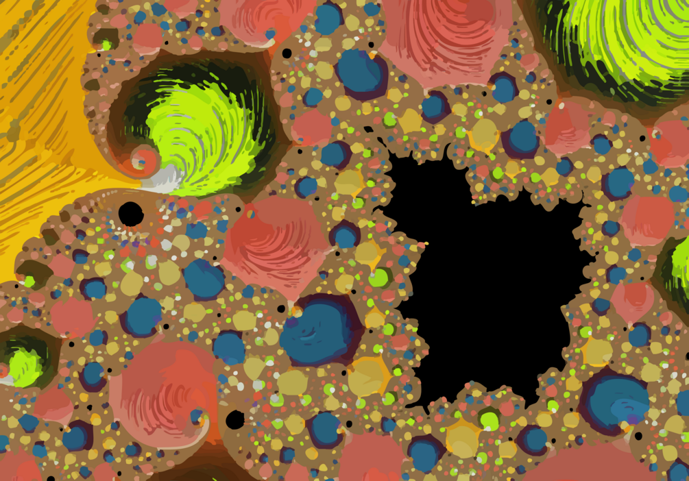 Very abstract and mathematical (such as Mandlebrot/Julia sets) patterns remixed and mangled again and again to create new pieces.